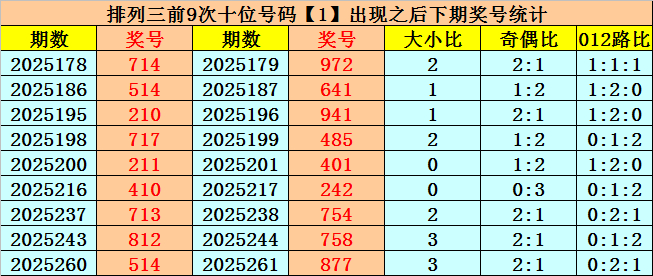 十位号码:十位上期开出偶数、小 号、1路号码:1,历史上十位号码1共开出727期,上一次出现在第2025260期,上期奖号遗漏值为1期。