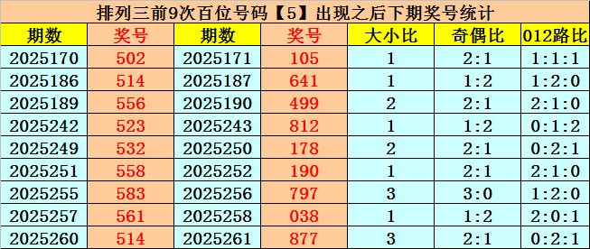 在百位前9次出现号码5之后,下期百位分别开出奖号:1-6-4-8-1-1-7-0-8,其中开出号码个数大小比是4:5,012路比是2:5:2,奇偶比是4:5。