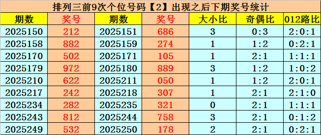 个位号码:上期奖号为小 号、偶数、2路号码:2,历史上个位号码2共开出728期,前一次出现在第2025249期,上期遗漏12期再出。