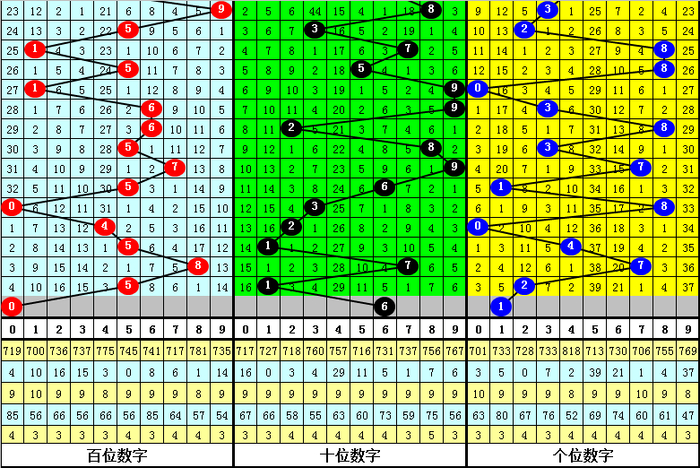 个位前9次开出号码2时,该位下期奖号分别为:6-4-5-9-0-7-1-8-8,其中号码个数奇偶比是4:5,大小比是6:3,012路比是3:3:3。