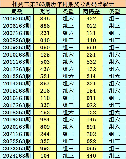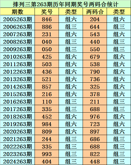 排列三从2004年开奖至今已开出7386期奖号了,其中第263期历史同期奖号出现20次,历年第263期分别开出号码:846、886、231、040、050、425、503、436、521、857、216、110、335、452、984、809、244、335、993、404。